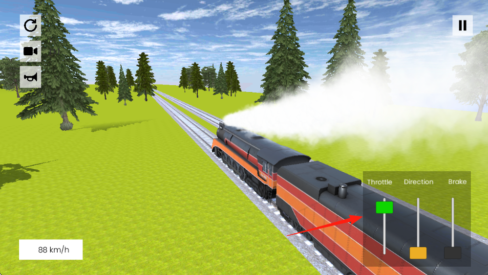 1、在車站場景,調(diào)節(jié)右側(cè)Throttle節(jié)流閥,綠色桿,推動增加動力,火車從0km/h→88km/h啟動,沿軌道行駛。