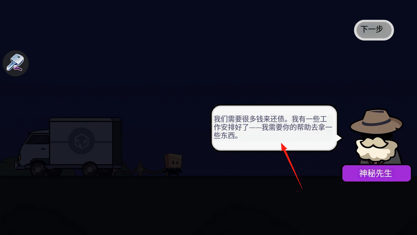 1、進入游戲初始對話場景,神秘先生提出債務問題與工作需求,點擊下一步,推進劇情,借助對話引導機制,了解任務背景,通過操作,開啟冒險流程,感受敘事驅(qū)動的玩法。
