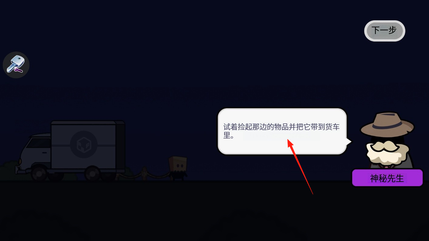 2、對話更新后,神秘先生發(fā)布物品搬運任務,點擊下一步,明確行動目標,利用任務指引機制,知曉操作方向,通過操作,準備執(zhí)行撿拾與運輸,體驗任務執(zhí)行的開端。
