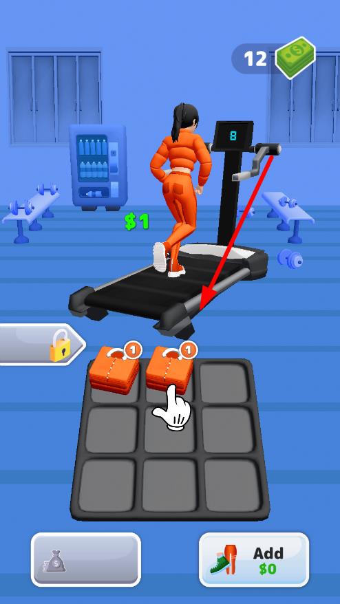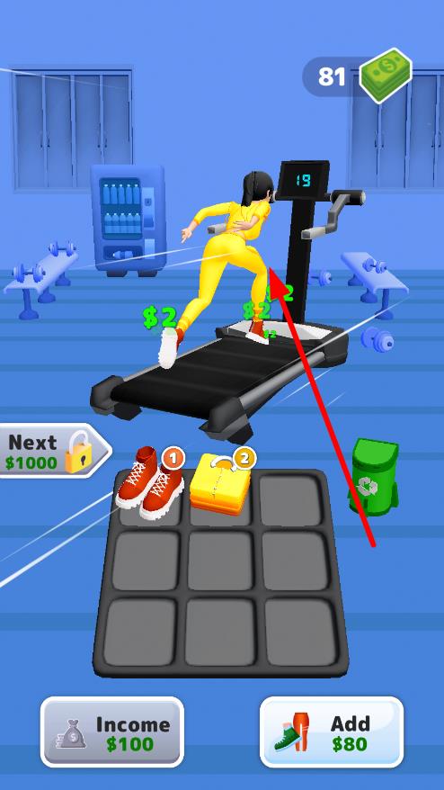 1、進入游戲,角色在跑步機運動,點擊下方格子中的道具,放置到跑步機區(qū)域,為角色運動助力,開始賺取金幣。