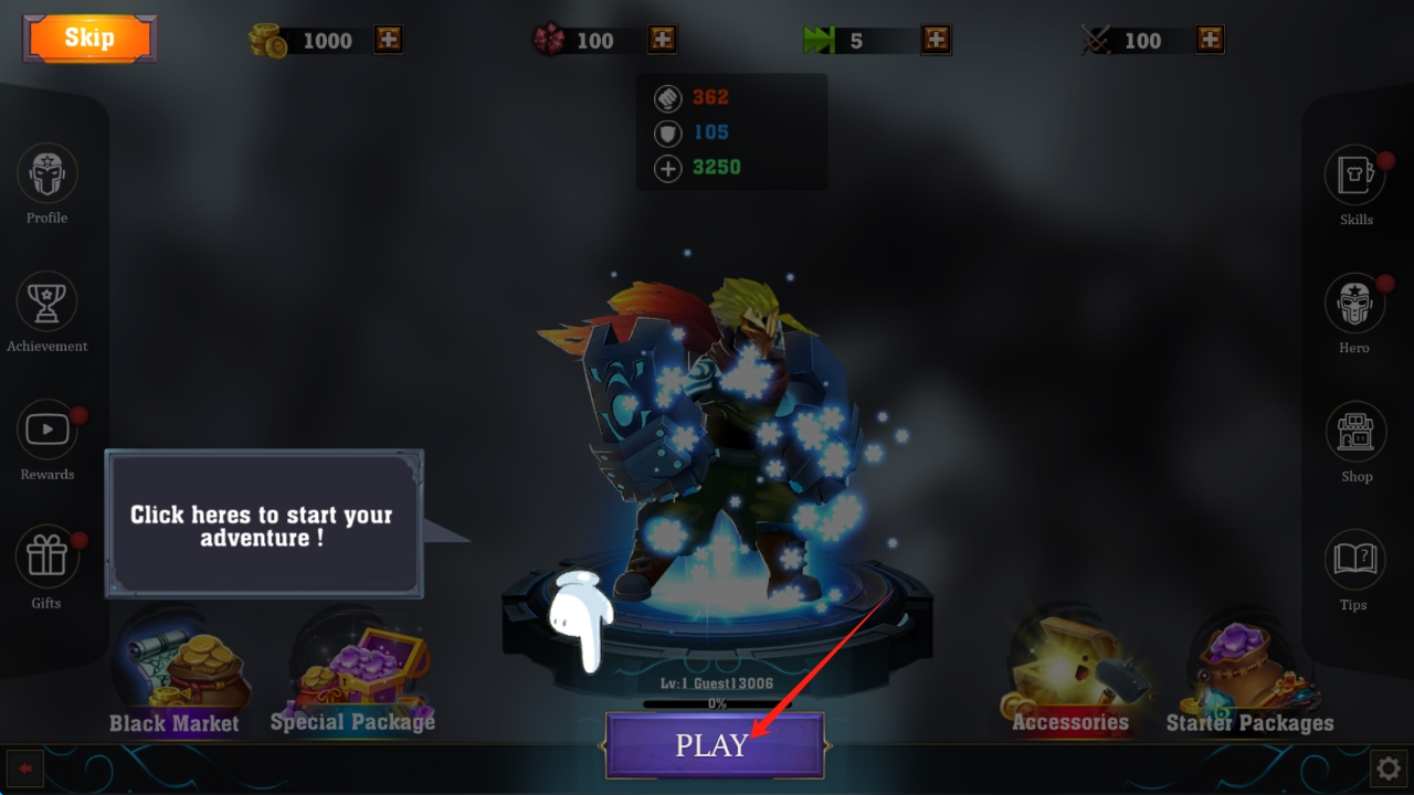 1、在游戲啟動界面,點(diǎn)擊PLAY,開啟動作冒險(xiǎn)之旅,投身奇幻戰(zhàn)斗世界,點(diǎn)擊按鈕開始游戲。
