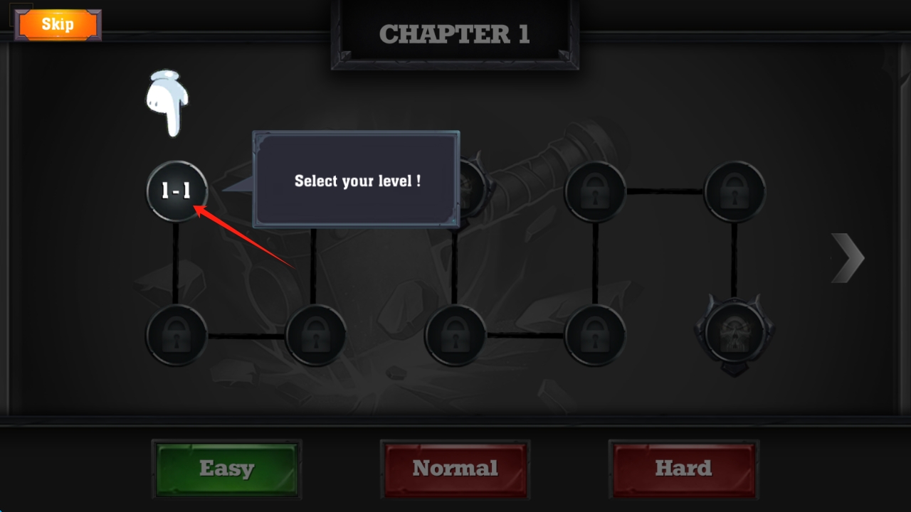 2、章節(jié)關(guān)卡選擇時,按需選Easy、Normal或Hard難度,點(diǎn)擊1-1,進(jìn)入第一關(guān)挑戰(zhàn),點(diǎn)擊選擇關(guān)卡。