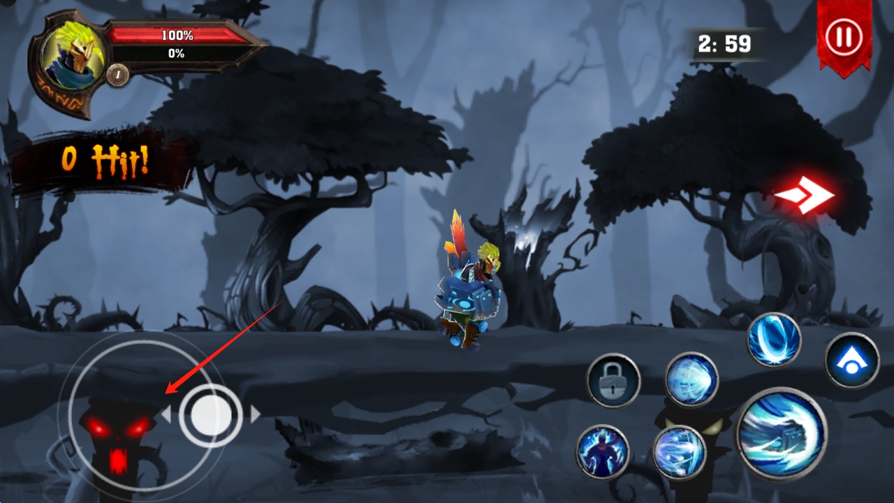 3、戰(zhàn)斗中,滑動左側(cè)搖桿,操控角色移動,點(diǎn)擊右側(cè)技能按鈕,釋放技能擊敗敵人,撥動輪盤移動人物。