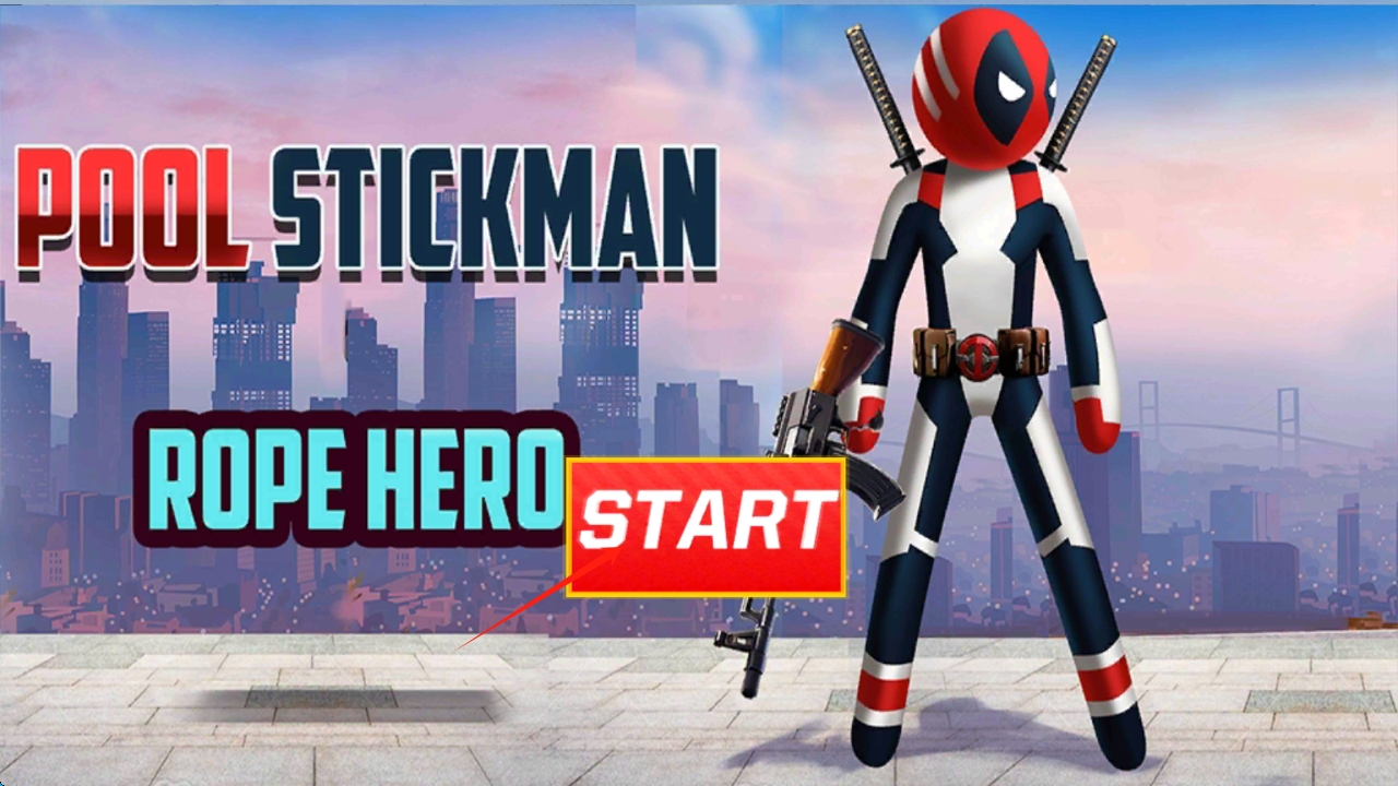 1、在Pool-Stickman-Rope-Hero界面,點擊START,開啟火柴人繩索英雄的城市冒險,點擊開始游戲。