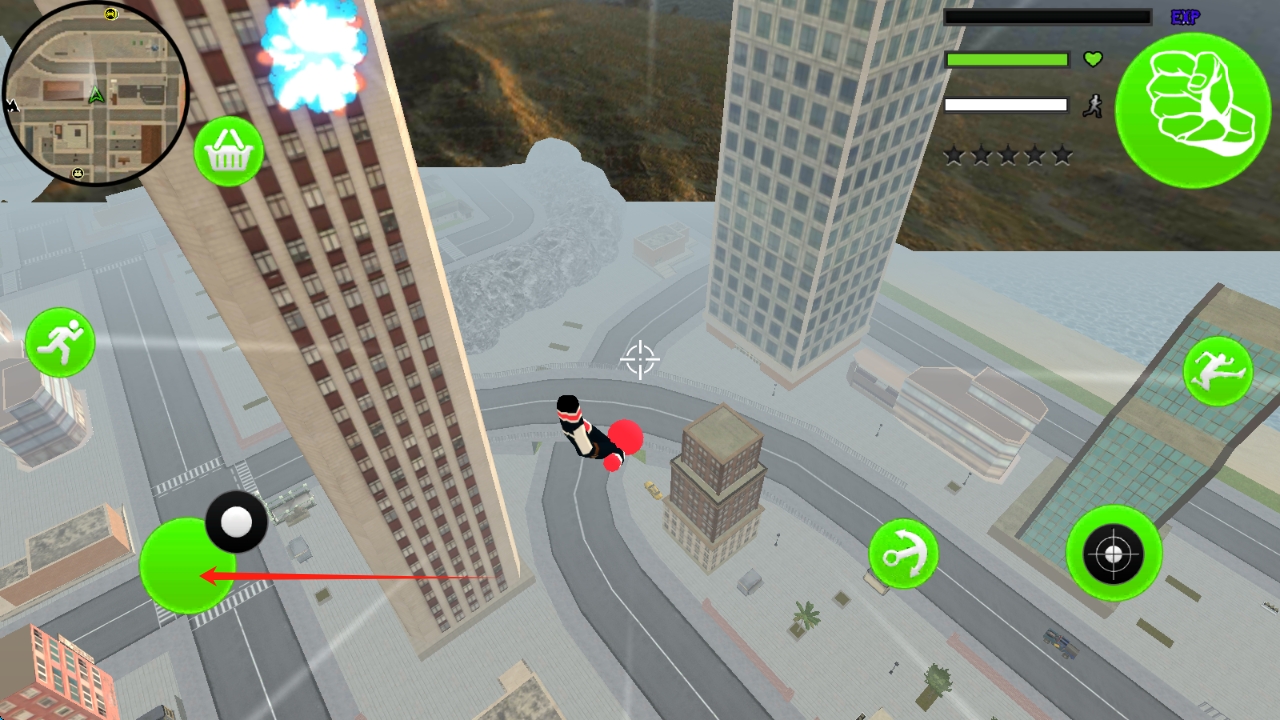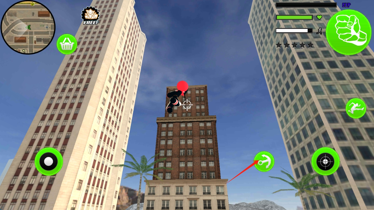 3、點擊右側(cè)錨鉤按鈕,讓角色射出繩索,借助繩索在城市建筑間移動,跨越障礙,點擊蛛網(wǎng)飛躍。
