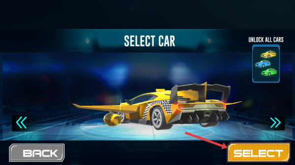 1、選黃色飛行汽車,點(diǎn)SELECT進(jìn)入賽道。