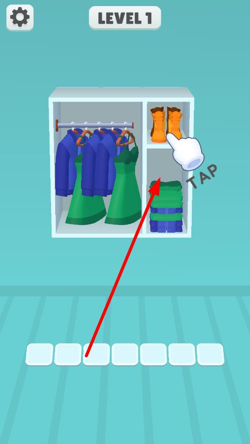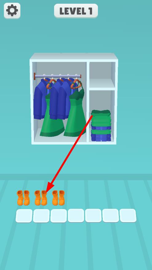 1、進(jìn)入關(guān)卡,觀察衣柜內(nèi)物品分布,根據(jù)提示點(diǎn)擊待分類物品,如第一關(guān)點(diǎn)擊橙色靴子,將其從衣柜格子移至下方對應(yīng)區(qū)域,開啟整理流程。