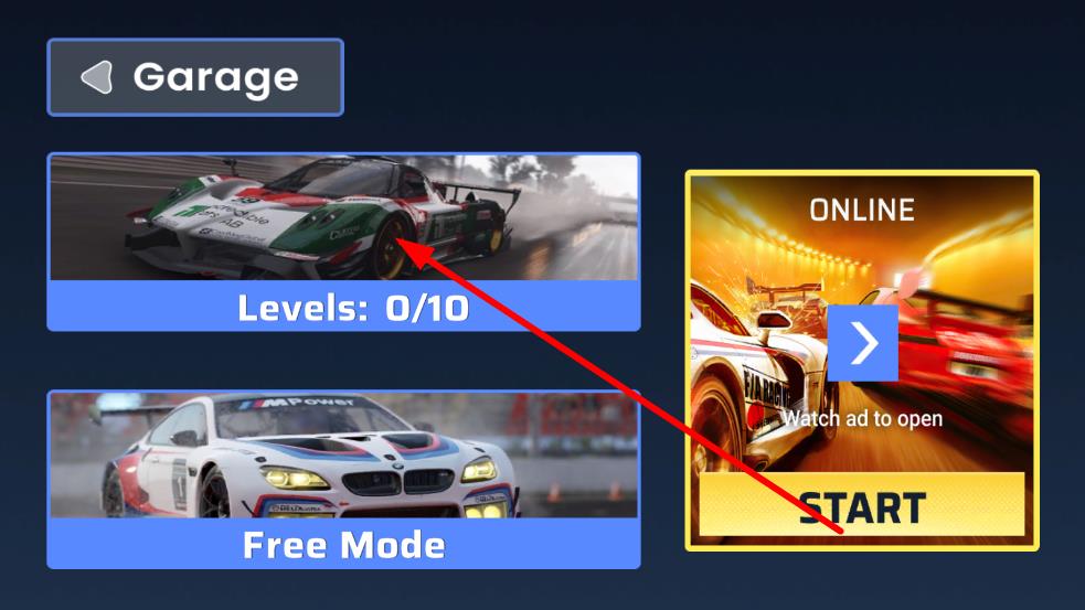 1、在初始界面點(diǎn)擊“START”進(jìn)入選車頁(yè)面,選擇心儀豐田車型,再選“Levels”或“Free Mode”等模式,開啟駕駛挑戰(zhàn)。