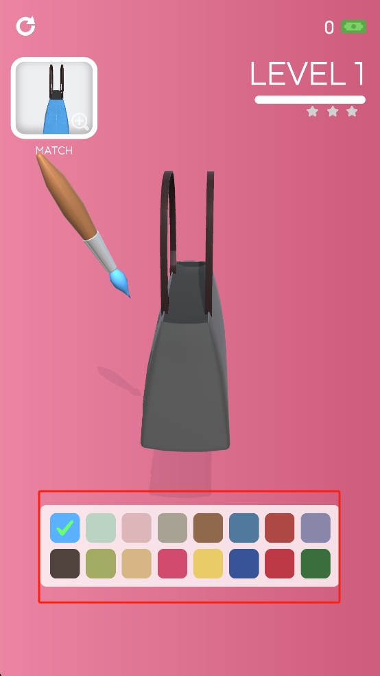 1、根據(jù)左上角預(yù)覽圖我們選擇調(diào)色盤左側(cè)帶對勾的藍色顏料,借助畫筆工具,對灰色包包進行染色,開啟定制流程。