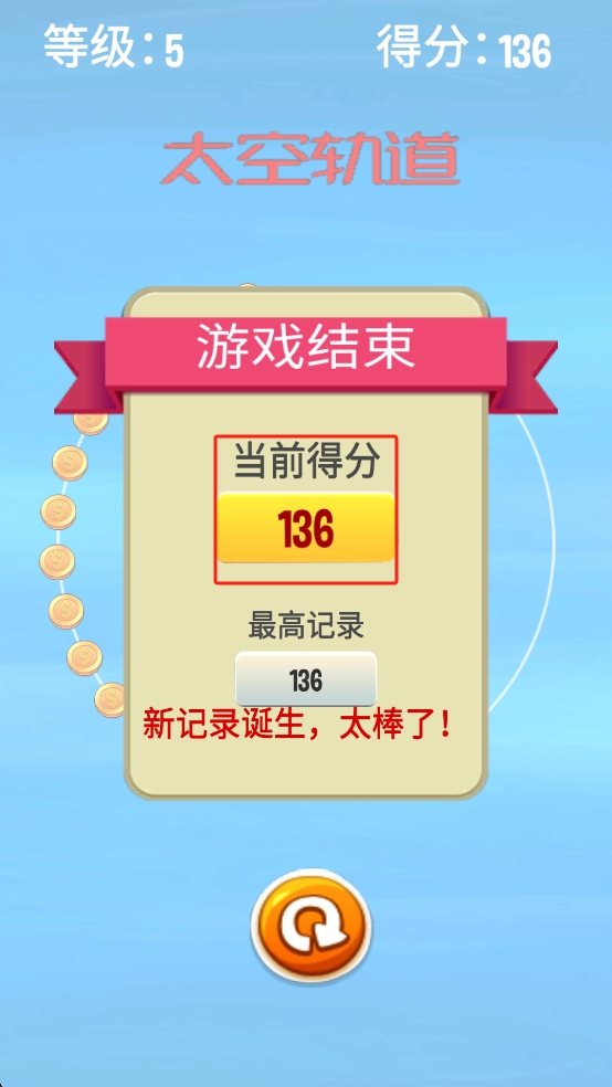 3、被炮打中游戲就結(jié)束了,界面顯示當前得分136且打破最高記錄,點擊下方橙色重置按鈕,即可重新開始挑戰(zhàn)。