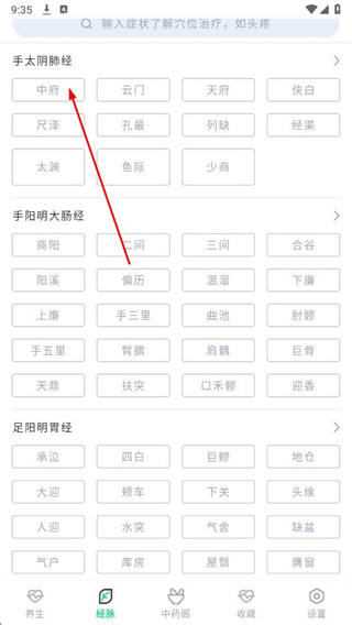 2、進入經(jīng)脈頁面后,可以看到不同經(jīng)脈分類以及對應(yīng)的穴位列表,點擊想要查看的經(jīng)脈中的具體穴位。