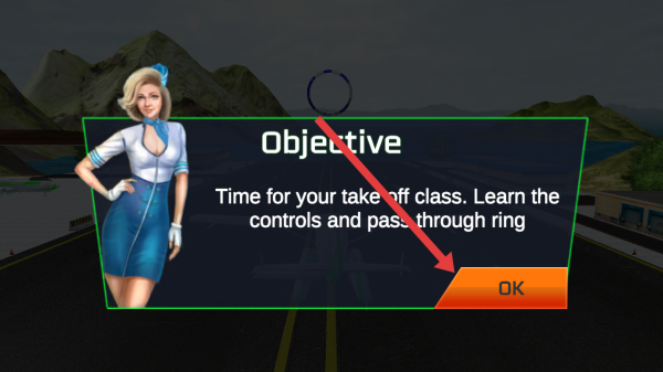 2、在任務提示界面,點擊橙色OK的按鈕,接受學習操控并穿過環(huán)形標記的起飛教學任務。