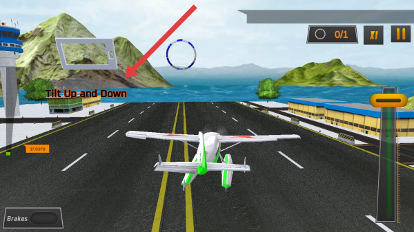 3、依據(jù)畫面的提示Tilt Up and Down,學習操控飛機傾斜,嘗試穿過空中環(huán)形標記,完成教學關(guān)卡。