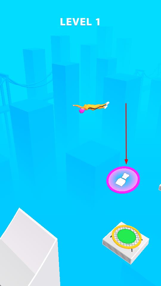 1、進(jìn)入游戲后,操控角色在藍(lán)色背景的城市環(huán)境中進(jìn)行運動,首先從高處跳下,落在綠色的蹦床上,借助蹦床的彈力繼續(xù)前進(jìn)。