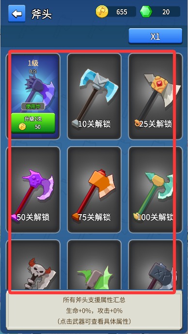 4、到達(dá)一定關(guān)卡后會解鎖更多強力的斧頭。