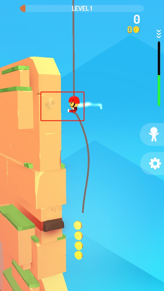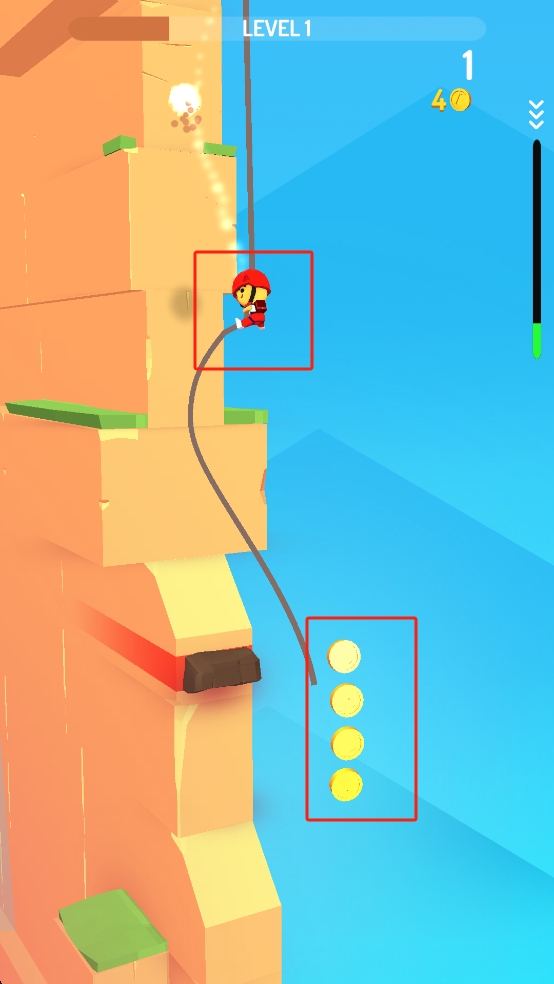 1、操控紅頭盔角色借吊繩擺動,觸碰巖壁借力,順路收集身旁金幣,規(guī)劃擺動軌跡向下攀爬。