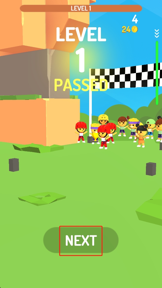 3、抵達終點后,點擊紅色方框內(nèi)的NEXT按鈕,進入下一關(guān),挑戰(zhàn)更復(fù)雜的攀爬與金幣收集任務(wù)。