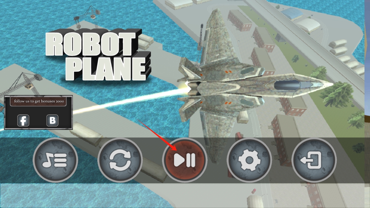 1、在Robot-Plane啟動(dòng)界面,點(diǎn)擊紅色播放按鈕,開(kāi)啟機(jī)器人飛機(jī)冒險(xiǎn),進(jìn)入游戲世界,點(diǎn)擊開(kāi)始游戲。