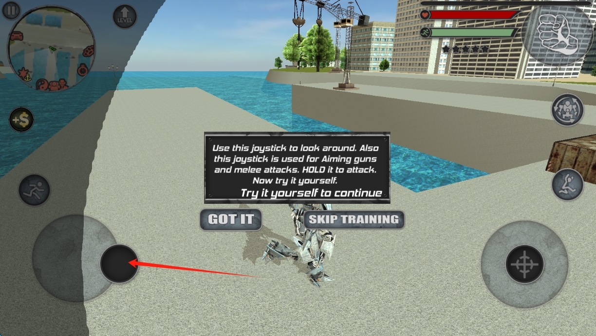 2、游戲內(nèi)教學(xué)場(chǎng)景,跟隨提示,使用虛擬搖桿,熟悉操控方式,為后續(xù)戰(zhàn)斗做準(zhǔn)備,撥動(dòng)輪盤(pán)移動(dòng)。