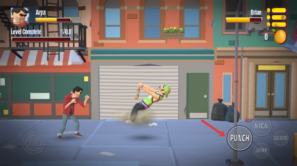 3、當敵人近身,點擊右側PUNCH按鈕出拳,擊飛敵人,持續(xù)輸出,完成Level1戰(zhàn)斗。