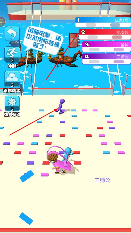 3、奔跑時(shí)留意道具與對(duì)手動(dòng)態(tài),合理使用強(qiáng)力牽引等技能,爭取率先抵達(dá)終點(diǎn),就能夠看到排名。