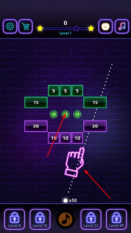 1、進(jìn)入界面,在Level1界面,瞄準(zhǔn)帶數(shù)字的磚塊,滑動(dòng)屏幕發(fā)射小球,小球碰撞磚塊消除并得分。