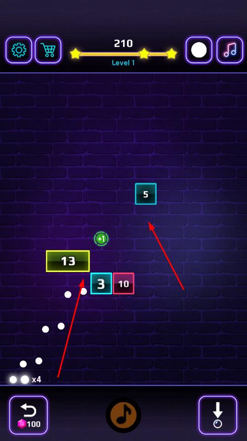 2、小球碰撞增益道具,可增加小球數(shù)量,持續(xù)讓小球撞擊磚塊,消除不同數(shù)字磚塊,積累分?jǐn)?shù)。