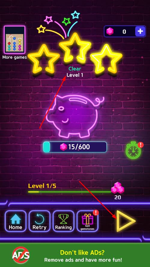 3、成功消除磚塊,完成Level1獲取獎(jiǎng)勵(lì),點(diǎn)擊三角形按鈕進(jìn)入下一關(guān),繼續(xù)打磚塊。