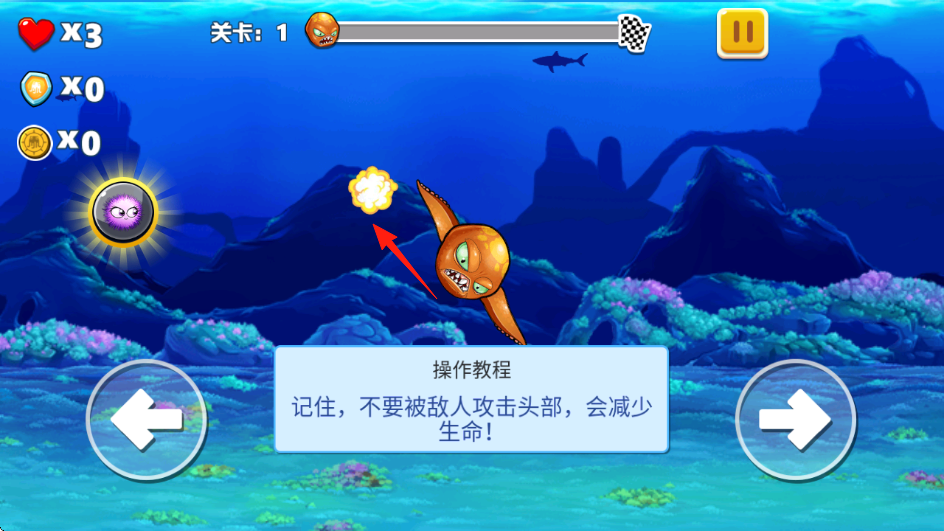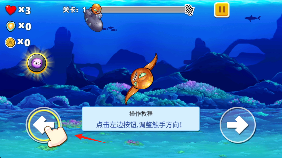 2、提示點(diǎn)擊左邊按鈕,調(diào)整觸手方向,不要被敵人攻擊頭部,會(huì)減少生命,指導(dǎo)玩家操作。