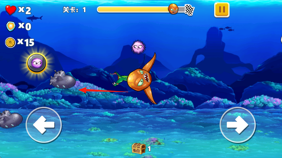 3、有橙色飛行怪、潛艇、鯊魚、寶箱、紫色毛球道具,背景是海底場(chǎng)景珊瑚、礁石等。
