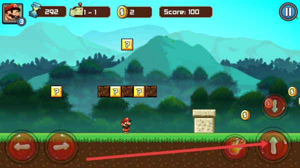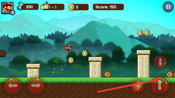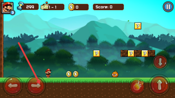 1、在進入游戲后,通過左下角的左右箭頭按鈕控制角色移動,在關卡場景中冒險,注意收集金幣以及踩踏敵人。