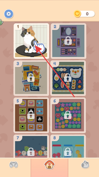 1、進入游戲后,在關卡選擇界面點擊標有數(shù)字1且?guī)в胸堖鋱D案的關卡卡片,進入第一關游戲。