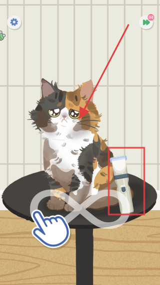 2、在游戲場景中,找到紅色方框內(nèi)的剃毛器道具,點擊該道具,然后對貓咪進行剃毛操作,完成這一步驟的任務。