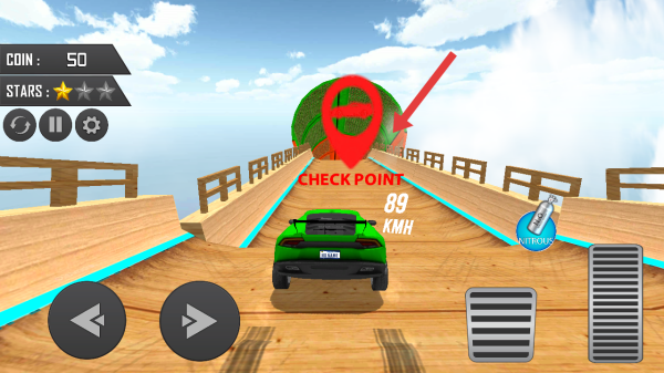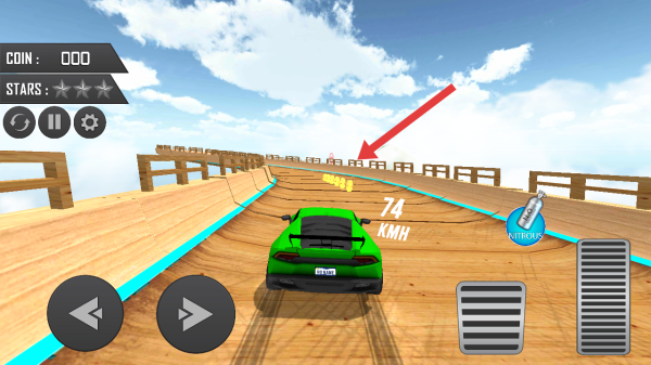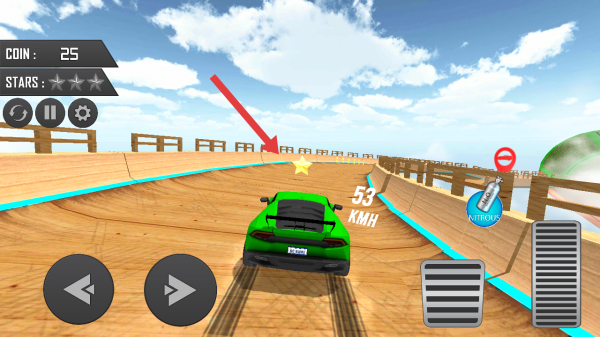 1、開局需要操控綠色跑車進行起步,利用右側(cè)油門鍵加速,沿著木質(zhì)賽道行駛,收集沿途的金幣。
