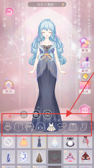 2、在自定義套裝界面,下方有多種服裝部件選項(xiàng),點(diǎn)擊紅色方框內(nèi)的服裝部件圖標(biāo),為角色更換對(duì)應(yīng)的服裝部件。