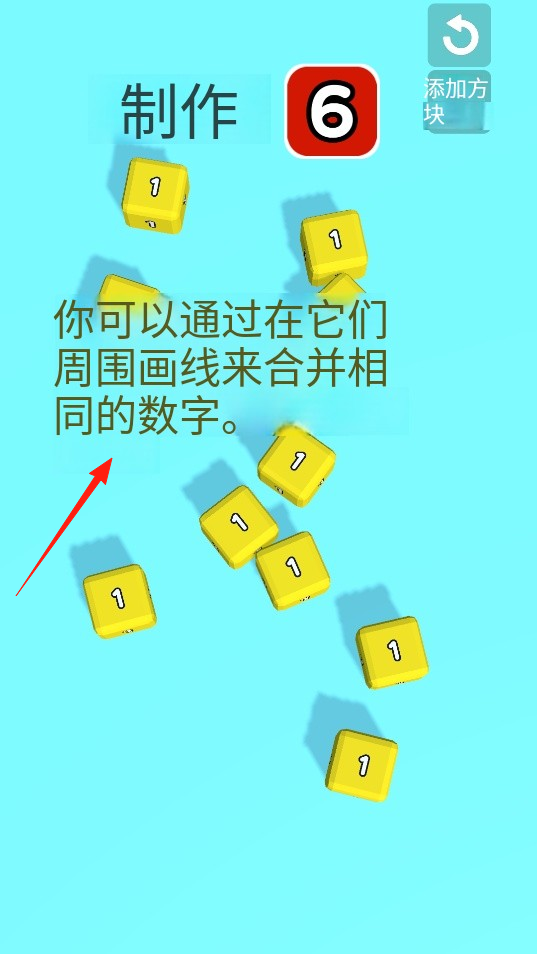 1、在包圍數(shù)字制作界面,觀察黃色數(shù)字方塊分布,用畫線方式,連接相同數(shù)字1的方塊,使其合并,通過畫線操作,減少方塊數(shù)量,向目標(biāo)數(shù)字推進(jìn),體驗(yàn)合并數(shù)字的機(jī)制。
