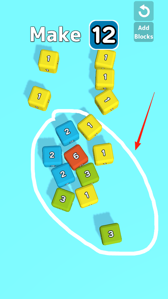 3、進(jìn)入新關(guān)卡,目標(biāo)數(shù)字為12,場景有多種數(shù)字方塊,規(guī)劃畫線范圍,圈選不同數(shù)字方塊,使其合并計(jì)算,通過組合圈選,讓方塊數(shù)字總和達(dá)12,體驗(yàn)組合合并的機(jī)制。