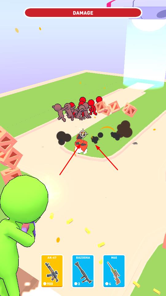 2、在射擊過程中,關注上方顯示的傷害值,努力提升傷害輸出,擊敗更多的敵人,同時避開賽道上的障礙物,如木箱等。