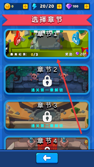 2、進(jìn)入選擇章節(jié)界面,點擊章節(jié)1,該章節(jié)最高紀(jì)錄0/3,完成可獲20獎勵,開始第一章挑戰(zhàn)。