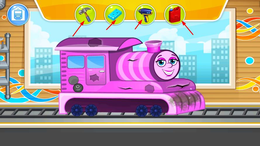 1、選擇車型與初始檢查:從車庫中挑選待修火車,通過觀察外觀與提示,初步判斷可能存在的故障,如冒煙的煙囪、破損的車窗,為后續(xù)修理確定方向。