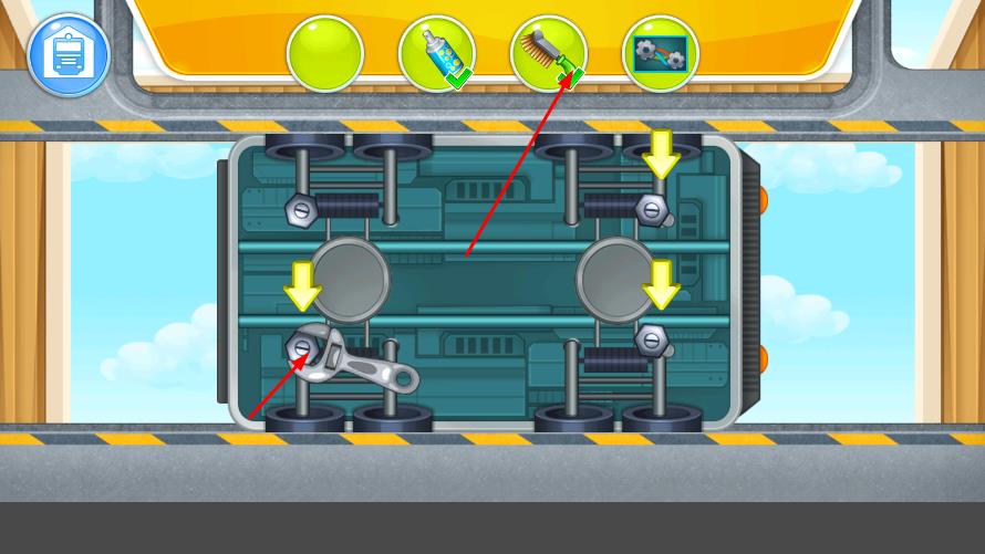 2、分步操作完成修理:根據(jù)故障類型,使用對應(yīng)的工具,用螺絲刀拆卸螺絲,、用顏料修補車身劃痕,按步驟完成零件更換與修復(fù),過程中可自由嘗試不同操作順序。