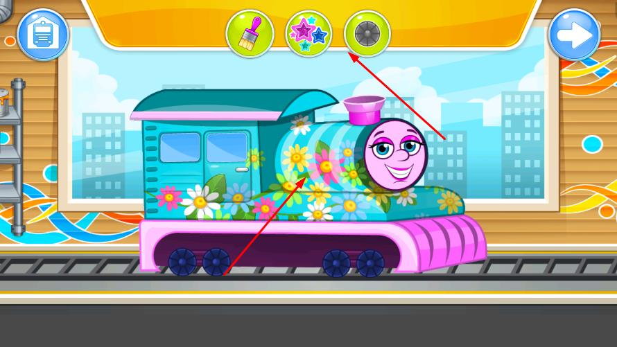 3、外觀和內(nèi)部修復(fù)好后,進入裝飾環(huán)節(jié),使用畫筆、貼紙等工具,為火車裝飾完成,展示修理好的火車。
