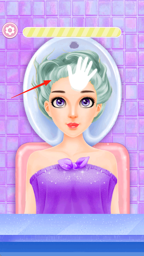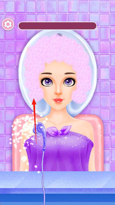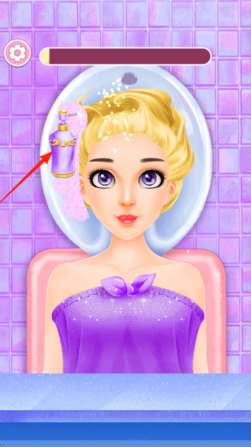 1、進(jìn)入游戲界面顯示角色準(zhǔn)備就緒洗頭,有洗發(fā)水,根據(jù)紅色箭頭指示把洗發(fā)水涂抹在頭發(fā)上。