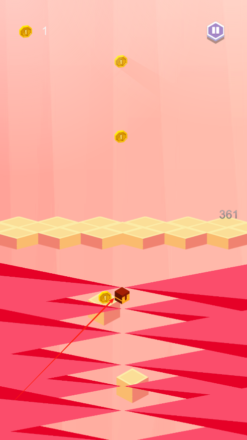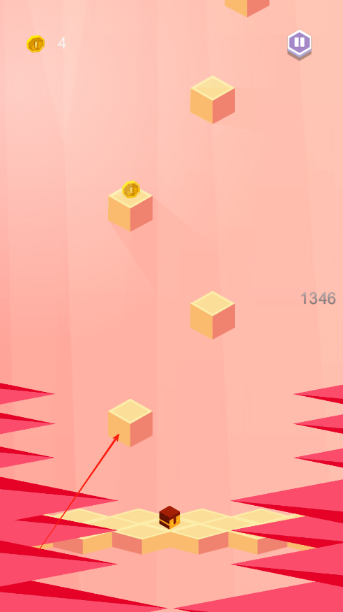 1、點(diǎn)擊屏幕讓小方塊開始跳躍,點(diǎn)擊一下之后,旁變得尖刺就會伸出來,碰到尖刺游戲·就會失敗,所以開始前注意觀察上方方塊移動規(guī)律。