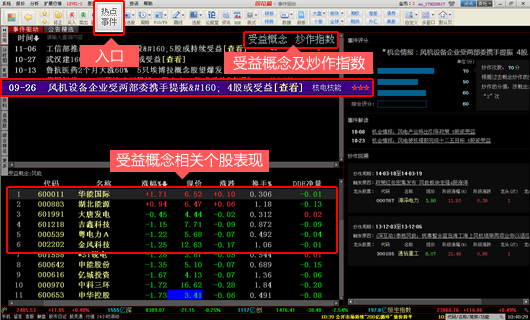 2、點擊相關(guān)事件可以查看受益概念及炒作指數(shù),左下方為個股表現(xiàn);