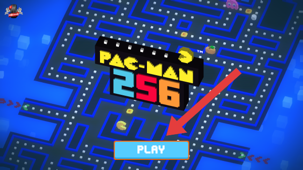 1、背景是經典的吃豆人迷宮的場景,點擊箭頭所指的PLAY的按鈕即可進入場景并開始游戲。