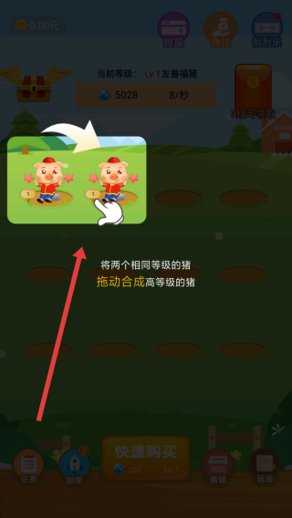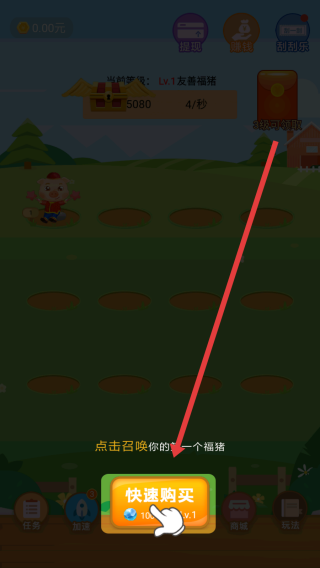 1、在游戲界面點(diǎn)擊快速購買按鈕,消耗對應(yīng)道具召喚福豬,增加可合成的基礎(chǔ)小豬數(shù)量。