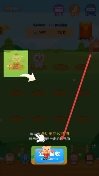 3、若需回收福氣值,拖動小豬至立即回收按鈕,確認(rèn)回收,獲取一定數(shù)量的福氣值用于其他操作。