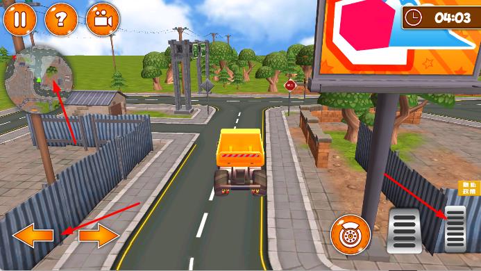 2、操控卡車,利用虛擬按鍵,控制移動(dòng)、轉(zhuǎn)向,在城市道路場(chǎng)景行駛,按照地圖指引前往目標(biāo)地點(diǎn)。