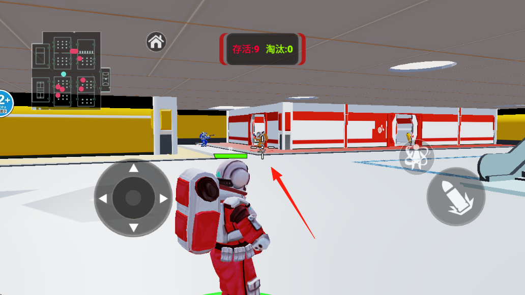 1、開局后,操控角色移動,根據(jù)箭頭指向,前往目標(biāo)區(qū)域,注意觀察場景中其他玩家,準(zhǔn)備戰(zhàn)斗。